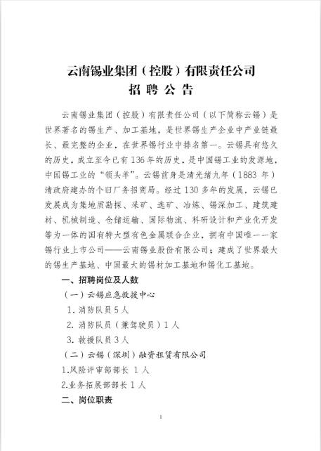 云南錫業(yè)集團(tuán)(控股)有限責(zé)任公司2019年招聘公告