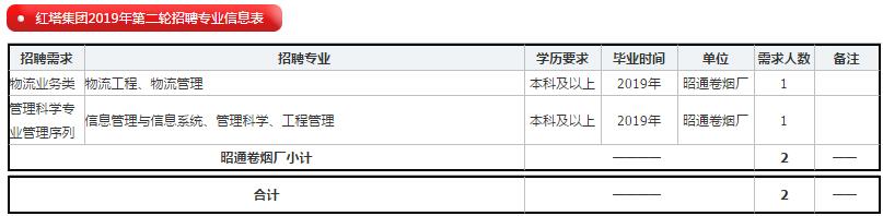 結(jié)合紅塔集團(tuán)昭通卷煙廠專業(yè)結(jié)構(gòu)及人員需求情況,現(xiàn)計(jì)劃新增招聘2人,具體招聘需求、專業(yè)、名額及相關(guān)條件詳見(jiàn)招聘專業(yè)信息表(見(jiàn)下)。