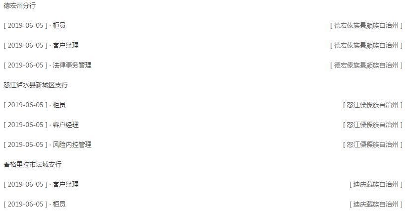 其中,怒江瀘水縣新城區(qū)支行、迪慶香格里拉縣壇城支行招聘學(xué)歷條件為具有國(guó)家統(tǒng)招的全日制普通高等院校大學(xué)?疲ê┮陨蠈W(xué)歷。